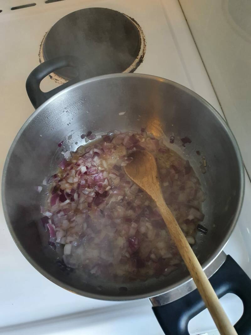 Fruit deze mix in een boter, en voeg dan ongeveer een goede laag witte wijn.