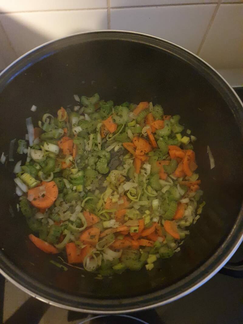 - rijst: groente bouillon maken, rijst daar in gechopte basilicum, peterselie en salie toevoegen